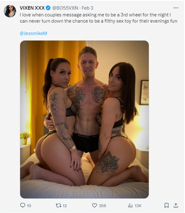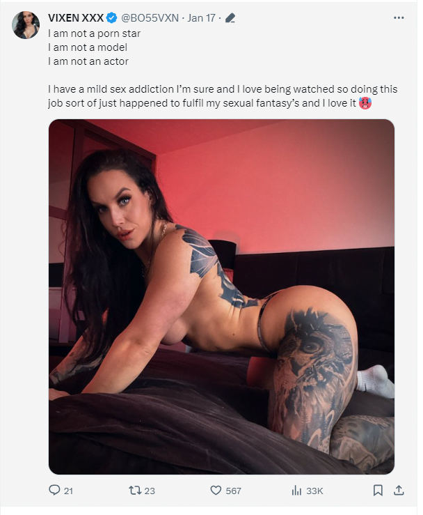 She has a high powered sex drive and she loves cock and pussy and as much as she can get. The tweet below sums up her attitude to sex and porn